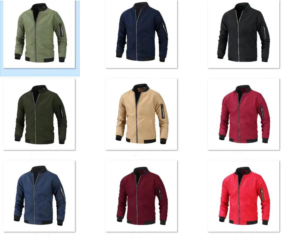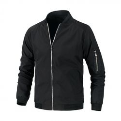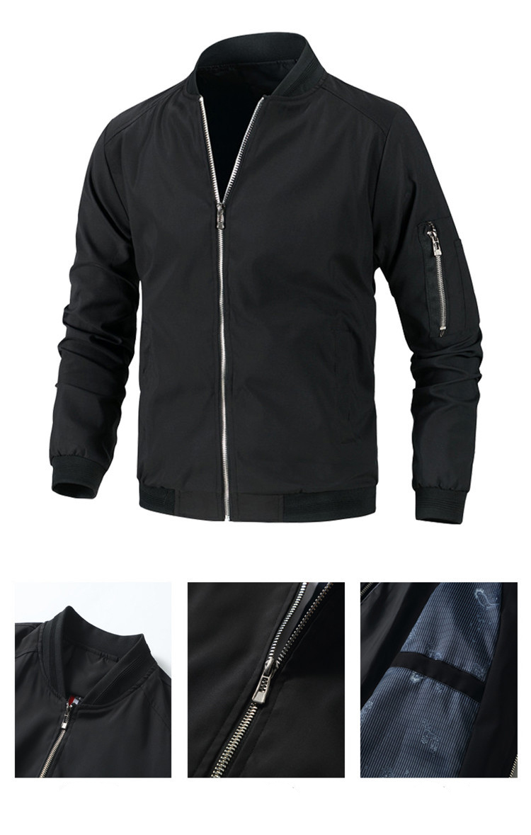 Full zipper stand collar bomber jacket, The zipper head is on the left. Rib Knit Cuffs, Waistband, Collar for comfort, pen pocket on sleeve.